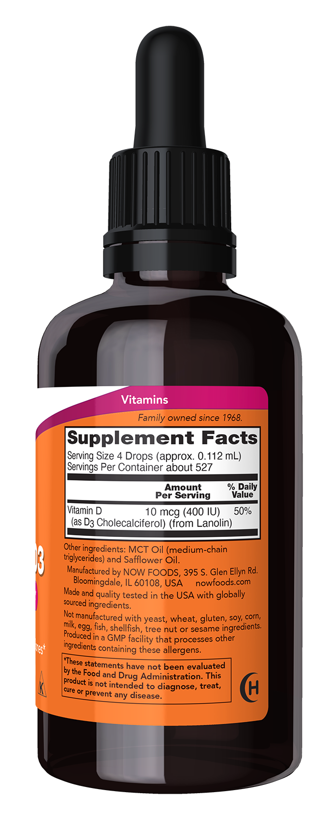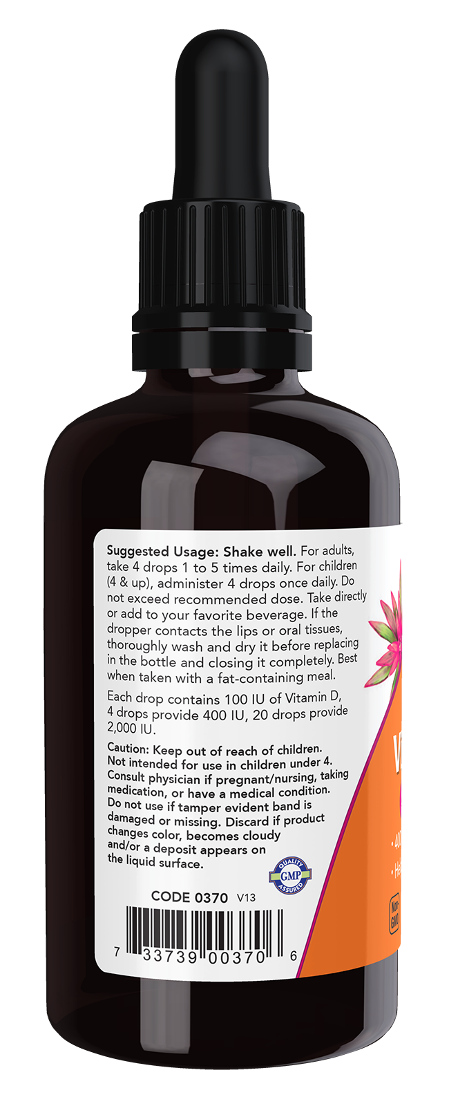 Специально разработанная жидкая формула подходит для всей семьи, включая детей старше 4 лет. Каждая капля содержит 100 МЕ витамина D; 4 капли обеспечивают 400 МЕ, 20 капель - 2 000 МЕ.